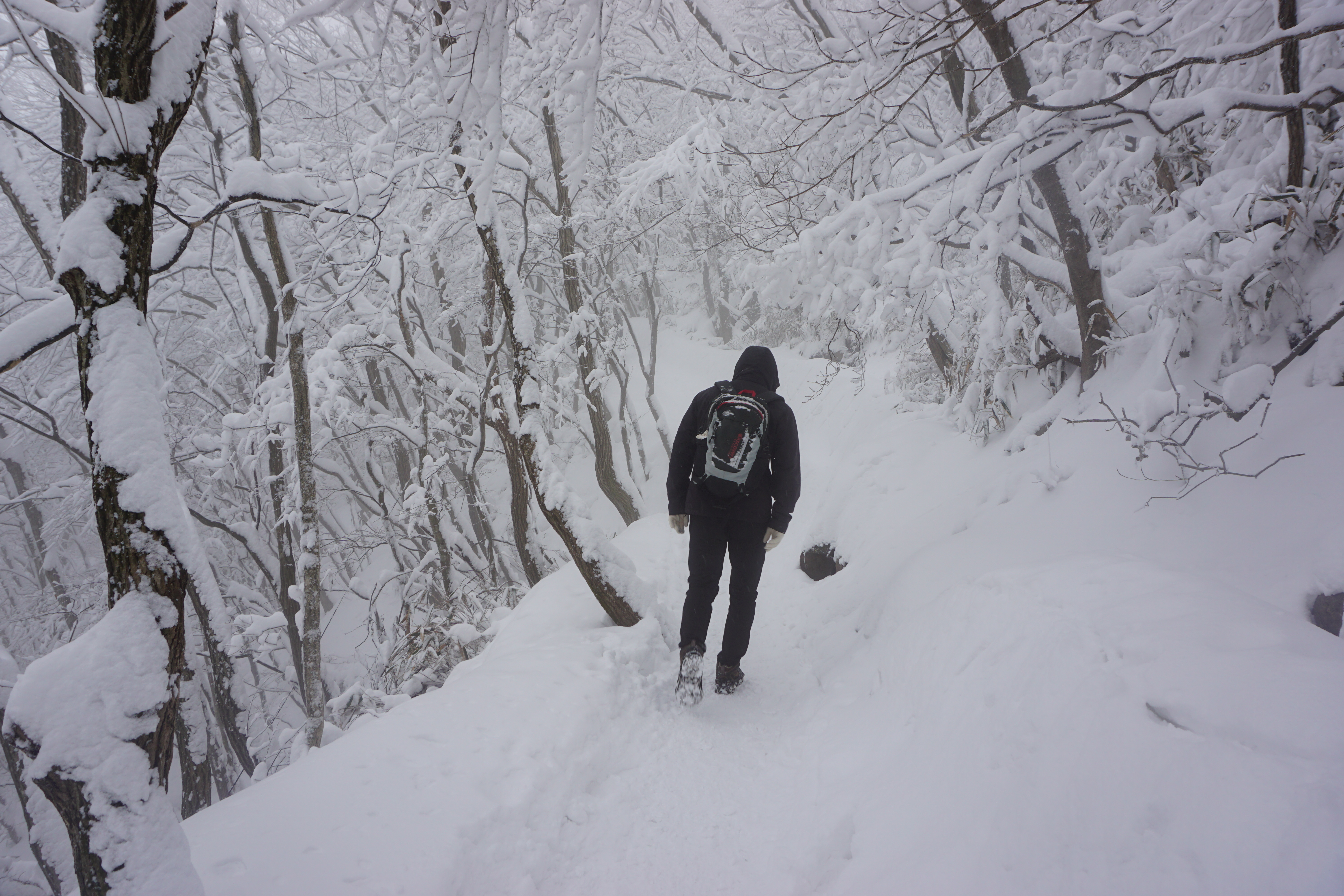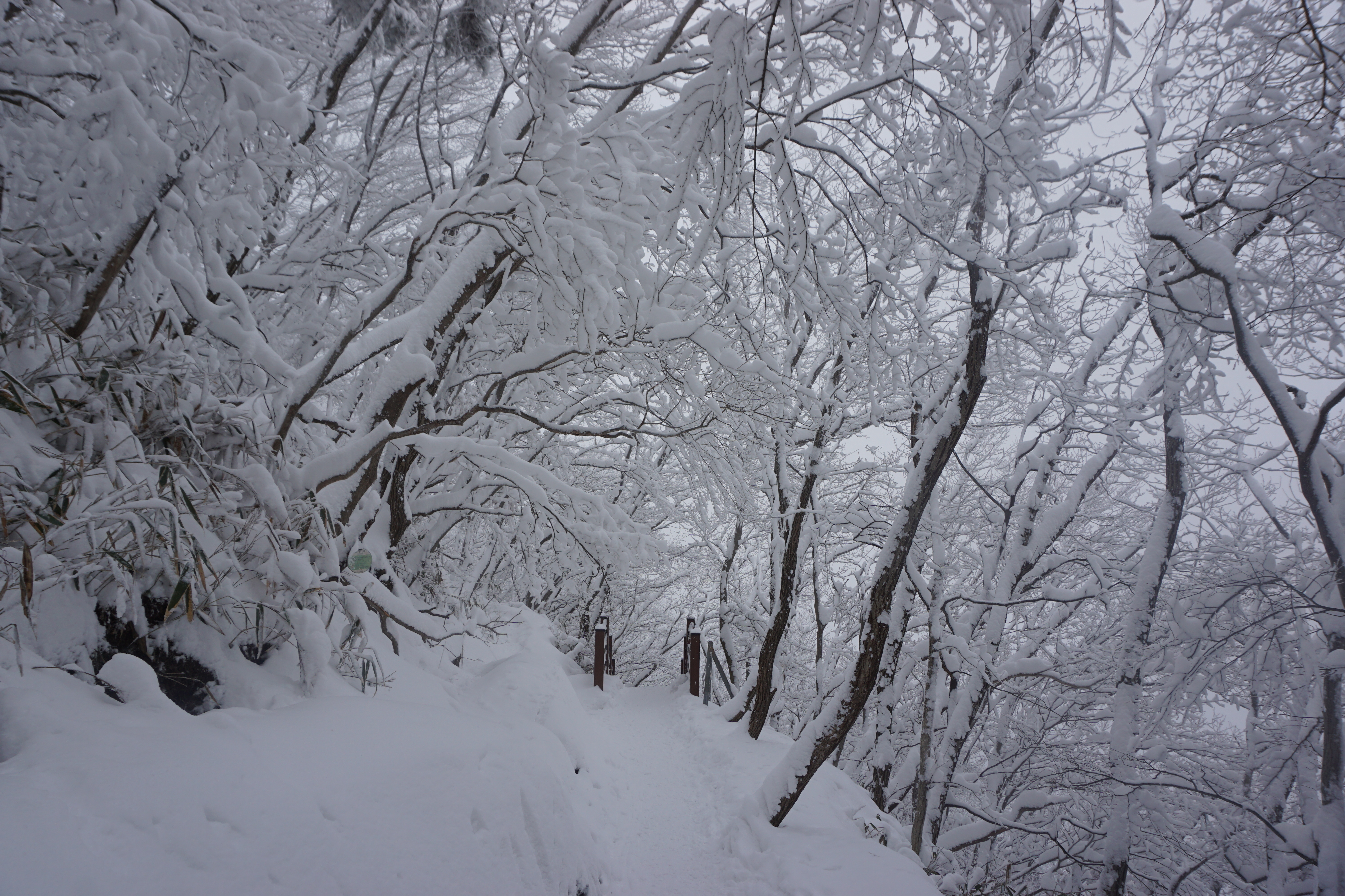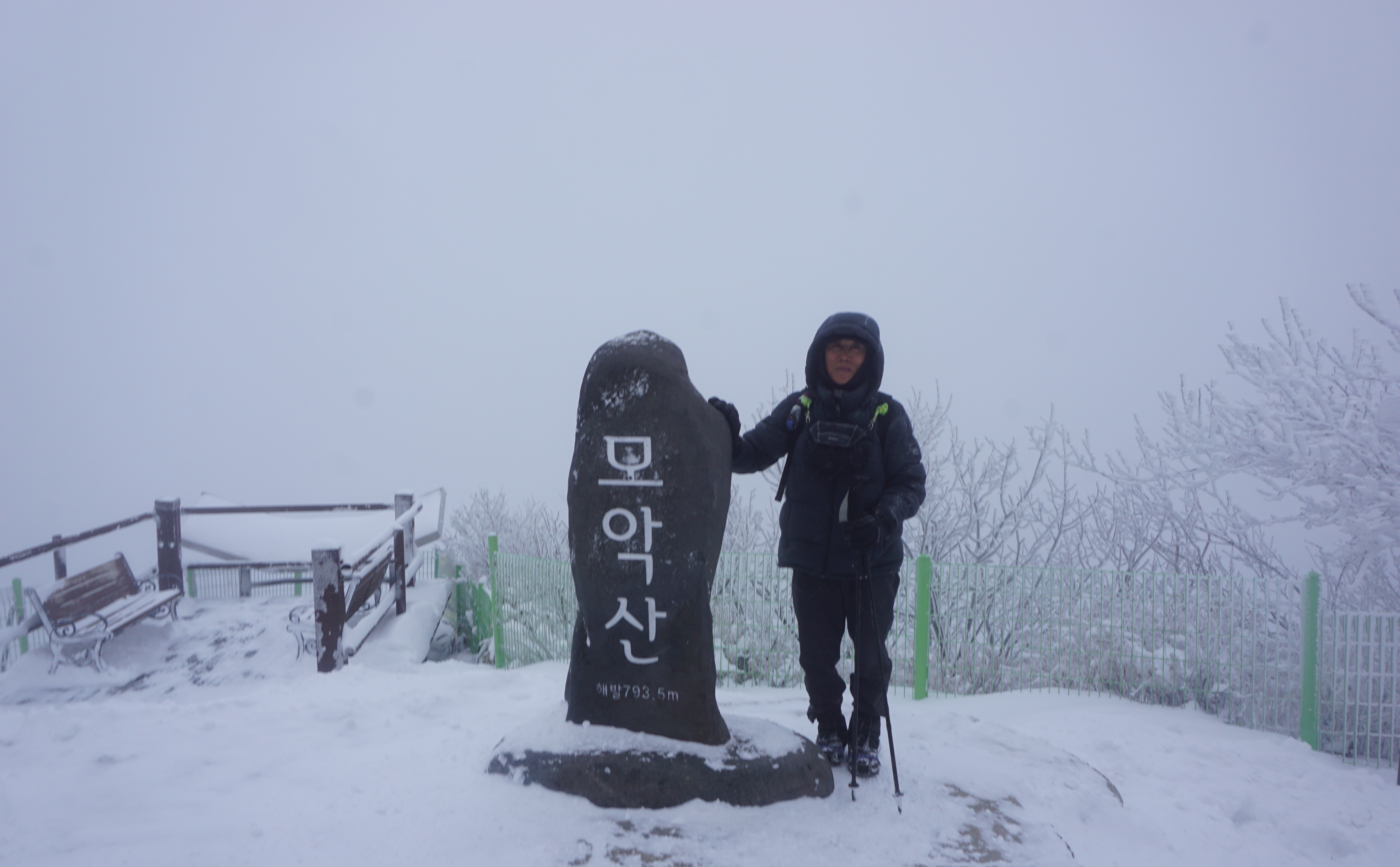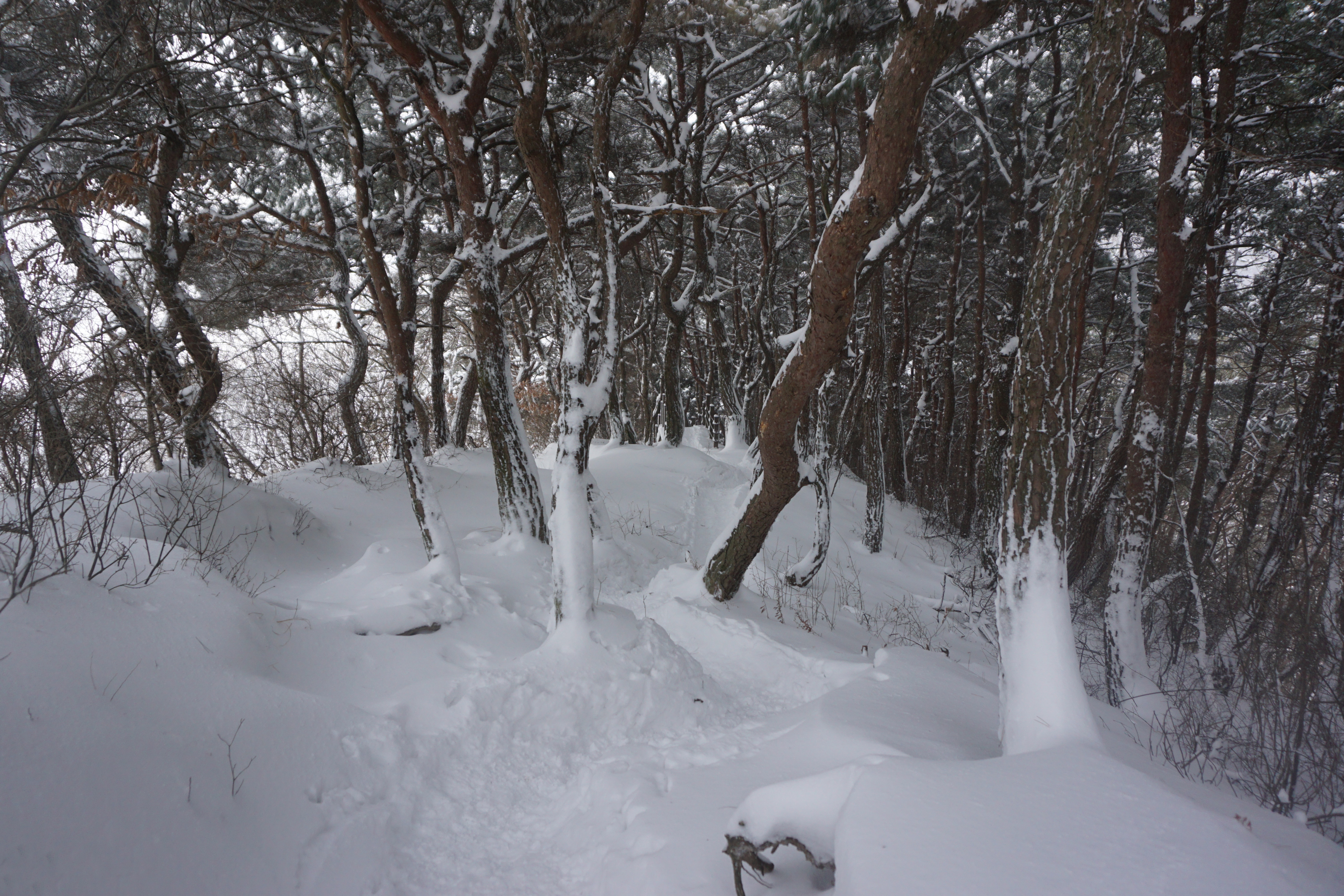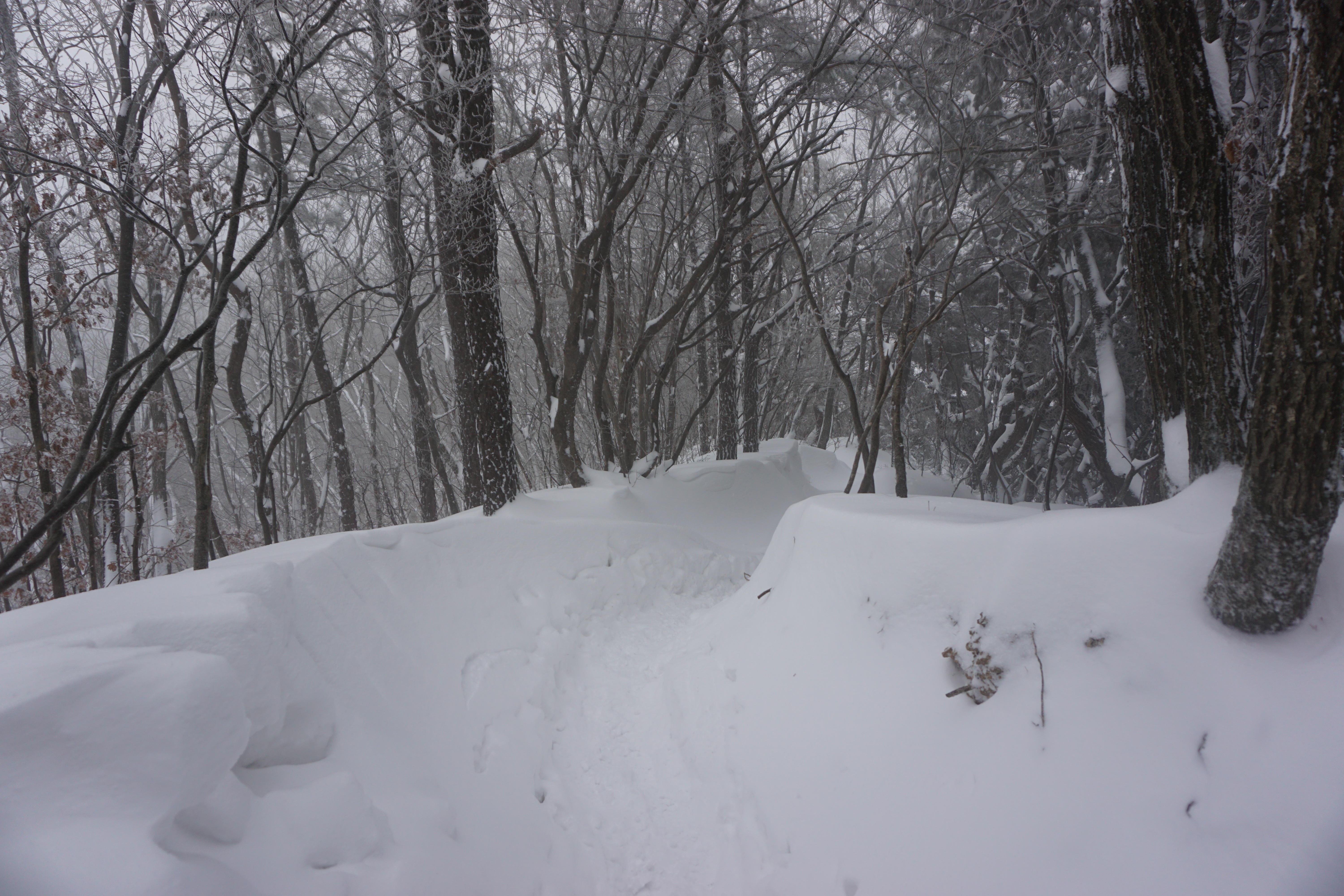모악산 입구에 도착하니 눈은 줄기차게 내리고 있어서 스페츠와 아이젠을 착용하고 출발하였다. 내가 지금까지의 모악산에서 처음으로 많은 눈길을 걸은 것 같았다. 곳곳에 눈이 밀어붙여 싸인곳이 많았고 가끔 눈보라도 몰아치기도 했다.